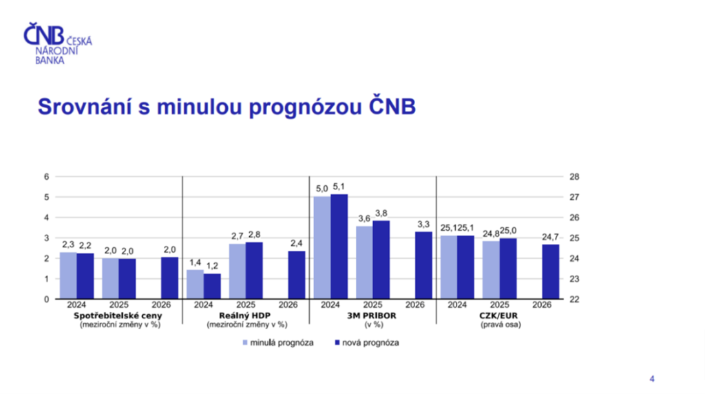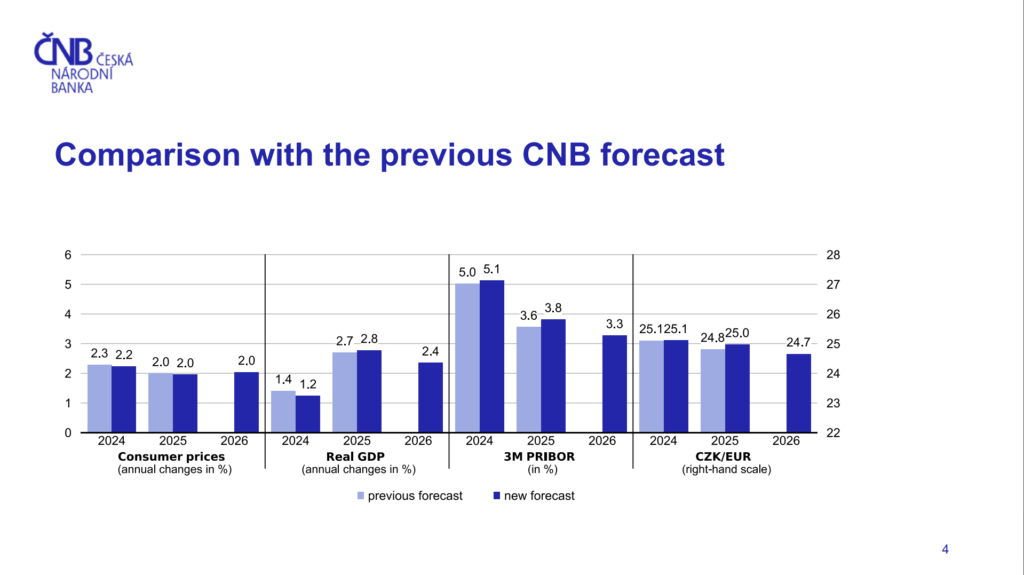 Česká národní banka (ČNB) v nové prognóze zhoršila ve srovnání s květnovou prognózou výhled české ekonomiky pro letošní rok. Očekává, že hrubý domácí produkt (HDP) vzroste o 1,2 %, zatímco v květnu předpovídala růst 1,4 %. Pro příští rok předpokládá ČNB zrychlení ekonomického růstu, kdy by HDP mělo vzrůst o 2,8 %, což je oproti předchozí prognóze zlepšení o 0,1 procentního bodu. V roce 2026 by měl růst ekonomiky zpomalit na 2,4 %.