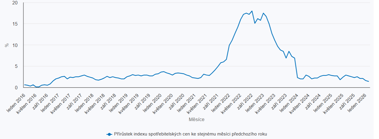 • Meziroční inflace: 1,4 % (pokles z lednových 1,6 %).